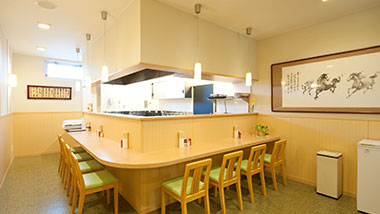 純和風で落ち着いた雰囲気の食事処です。掘りごたつ席とテーブル席があり、ゆったりと和食会席料理をお楽しみいただけます。